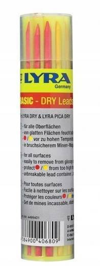 Kolorowe wkłady do ołówka automatycznego Lyra Dry, przeznaczone do używania na większości powierzchni, zarówno suchych jak i wilgotnych.