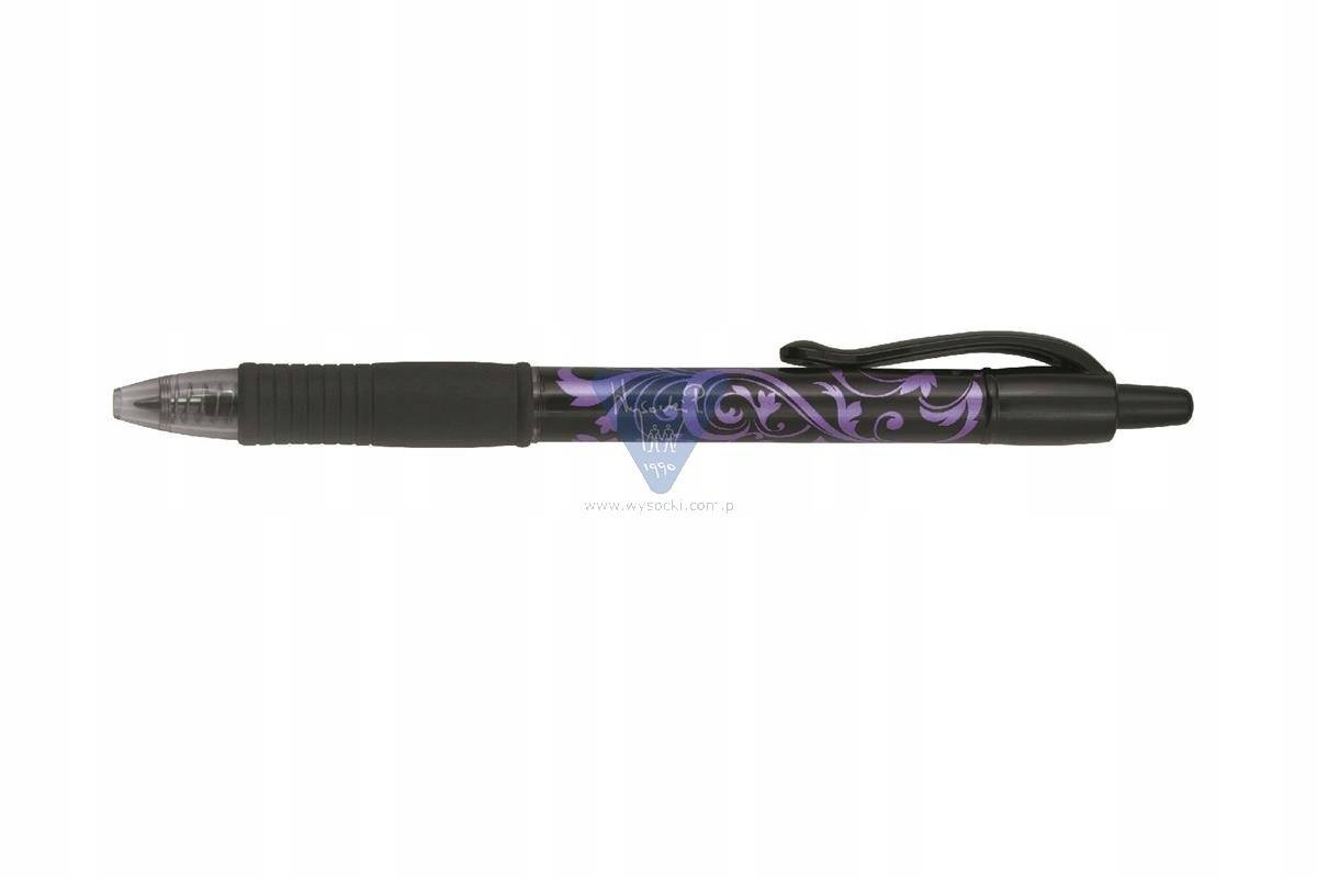 Długopis z wymiennym wkładem żelowym i gumowym, wygodnym uchwytem. Posiada czarną obudowę z motywem kwiatowym w kolorze tuszu. Grubość linii pisania 0,32 mm, długość linii pisania 1100.