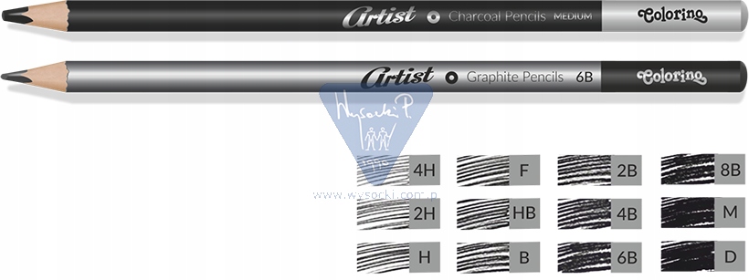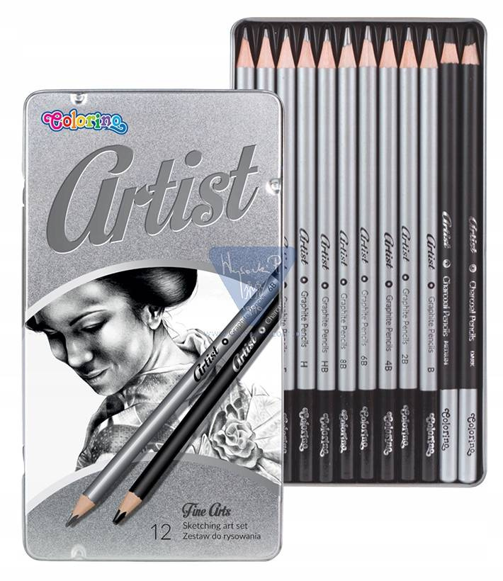 Zestaw zawiera : ołówki grafitowe w 10 stopniach twardości - 4H , 2H, H, F, HB, B 2B, 4B, 6B, 8B. oraz węgiel w 2 stopniach twardości - M i D , przeznaczone do wykonywania szkiców, projektów oraz rysunków architektonicznych.