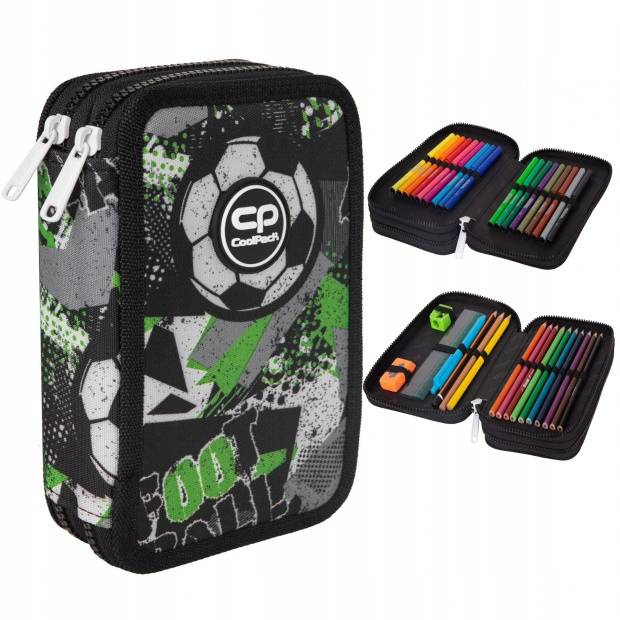 Piórnik podwójny z wyposażeniem Jumper 2 Let's Gol CoolPack. Piórnik Jumper 2 to fantastyczny dwukomorowy piórnik z wyjątkowym, bogatym wyposażeniem. Jest niezwykle praktyczny i funkcjonalny, ponieważ jego wnętrze pomieści wszystkie najpotrzebniejsze przybory szkolne. Świetnie sprawdzi się dla każdej osoby, która ceni sobie porządek i dobrą organizację. Zawartość piórnika: - 12 kredek ołówkowych, - 18 flamastrów, - ołówek i długopis, - linijka (15cm), - gumka do ścierania, - temperówka. Wymiary produktu: 20x13x5cm