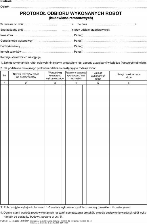 Protokół odbioru odbioru wykonanych robót budowlano-remontowych. Format A4. PU-Pb-34