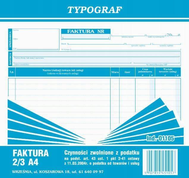 Faktura czynności zwolnione z podatku Typograf 01105 2/3 A4 80 kartek.
