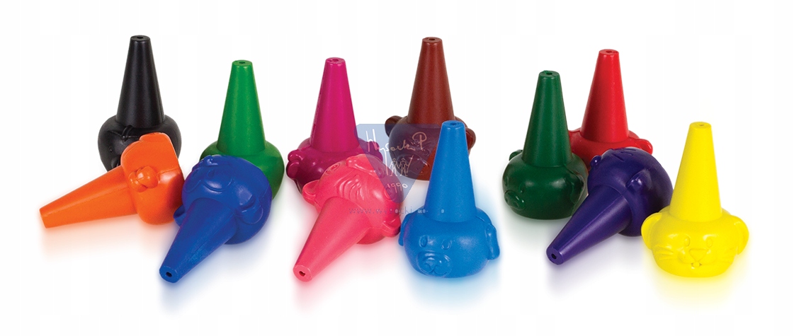 Kredki świecowe przeznaczone dla małych dzieci. Wyprofilowana w kształcie głowy zwierzątka kredka łatwa jest w trzymaniu w małej ręce dziecka. Dodatkowo kredki posiadają otwór dzięki któremu można je zakładać na palce i malować w kilku kolorach naraz. Opakowanie zaswiera 12 sztuk różnokolorowych kredek.