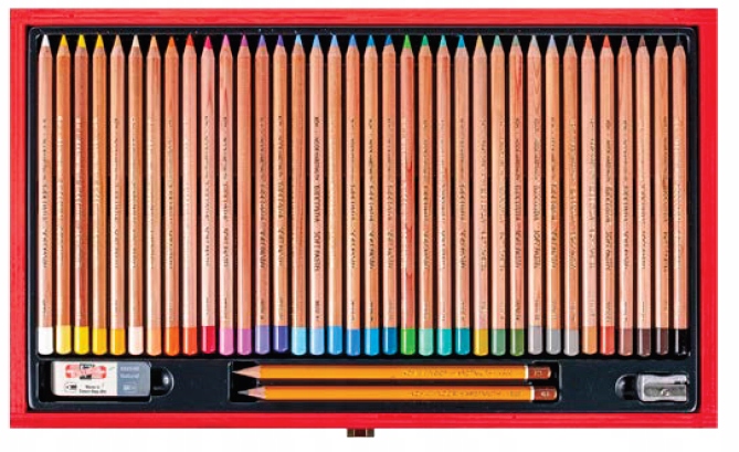 Zestaw zawiera 36 kolorów w drewnianej kasetce, 2 ołówki, gumkę oraz temperówkę.