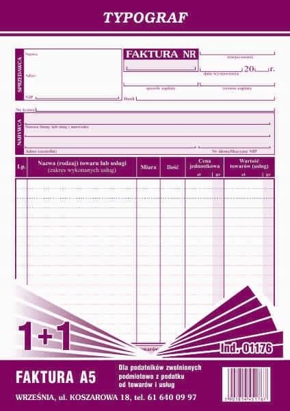 Faktura dla podatników zwolnionych z podatku od towarów i usług 1+1 Typograf 01176 A5 80 kartek.