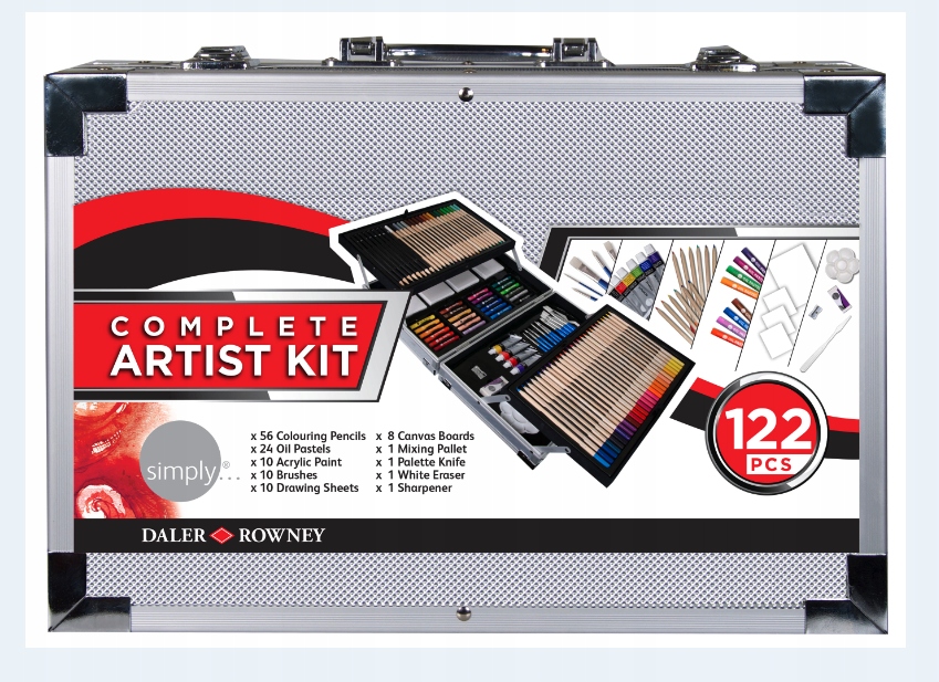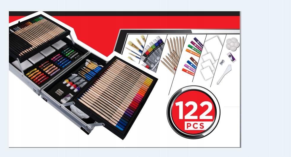 Obszerny zestaw materiałów artystycznych, zawierający w sobie 122 elementy w jednym opakowaniu.