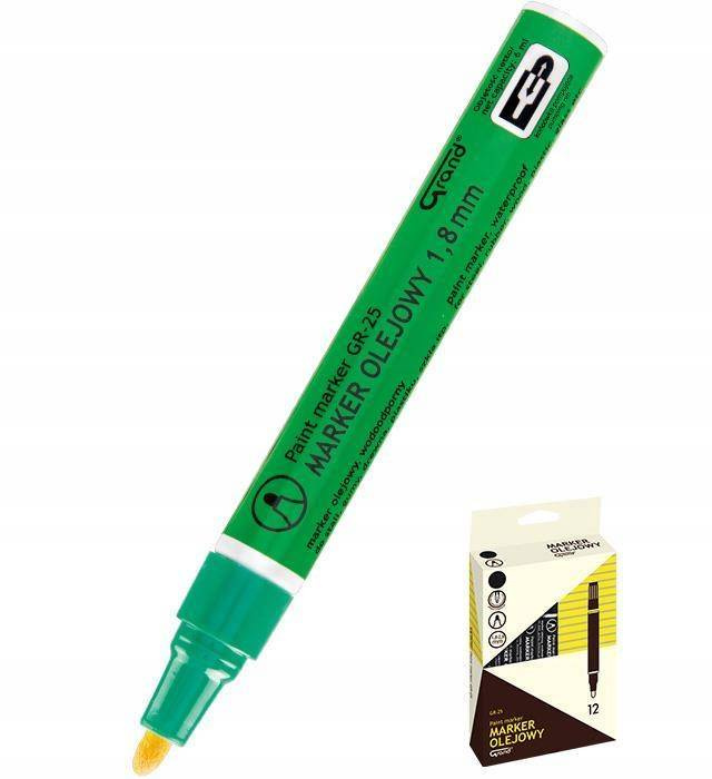 – wodoodporny, szybkoschnący tusz olejowy – nieblaknący, odporny na ścieranie – zastosowanie: stal, guma, drewno, plastik, szkło itp. – okrągła końcówka fibrowa – końcówka efektywnie pompująca tusz – grubość linii 1,8-2,8 mm – zielony kolor tuszu – opak. 12 szt.