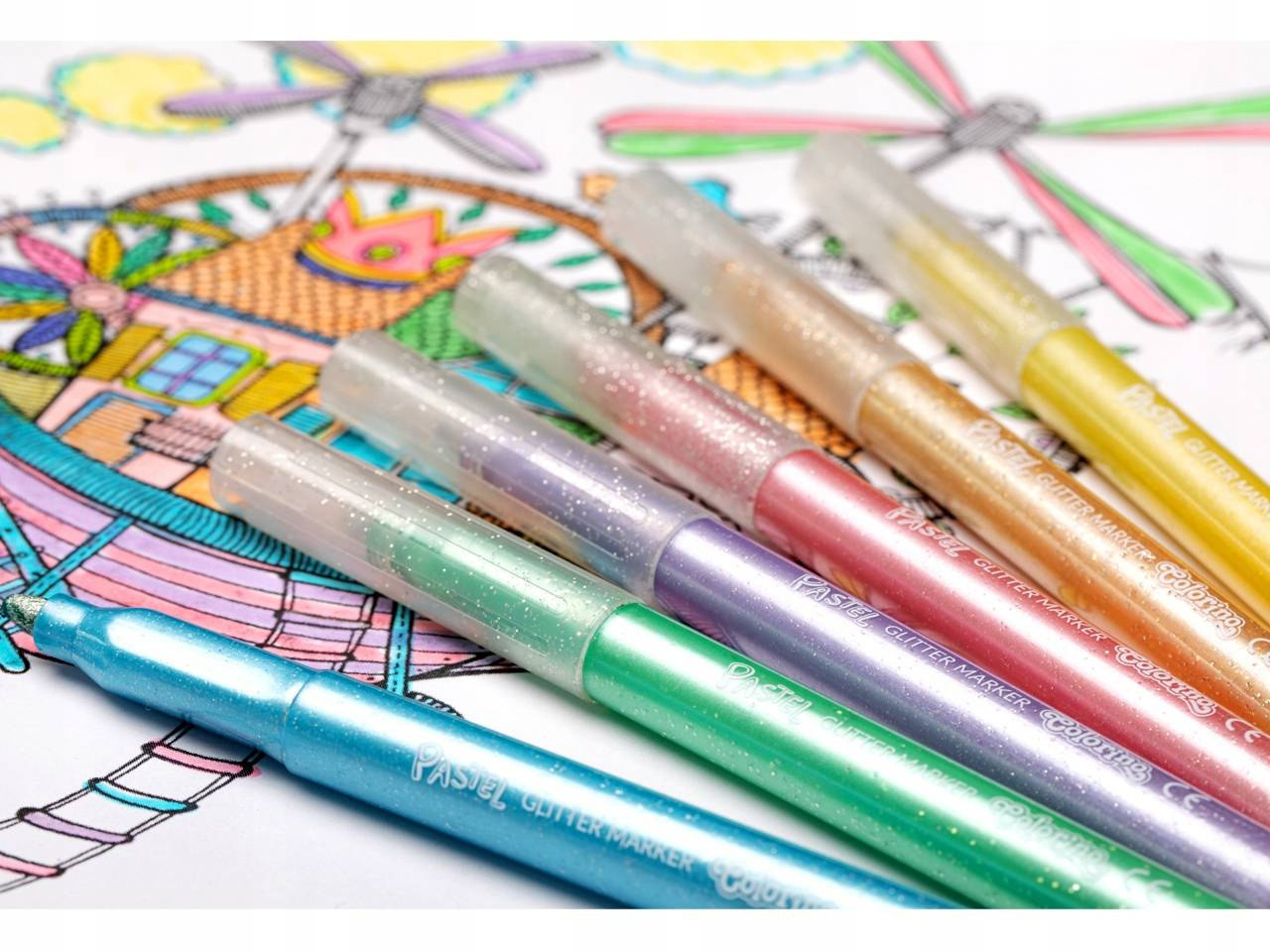 Flamastry z brokatem Pastel w sześciu kolorach doskonale nadają się do kreatywnych prac plastycznych, dekorowania papieru, tektury oraz tworzenia ozdób.