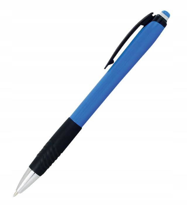 – automatyczny z wymiennym wkładem – ergonomiczna obudowa z uchwytem antypoślizgowym – idealny pod nadruk reklamowy – nie posiada żadnych oznaczeń – tusz wodoodporny – długość pisania: 1000 m – grubość linii 0,7 mm – niebieski kolor tuszu – opakowanie: 24 szt.