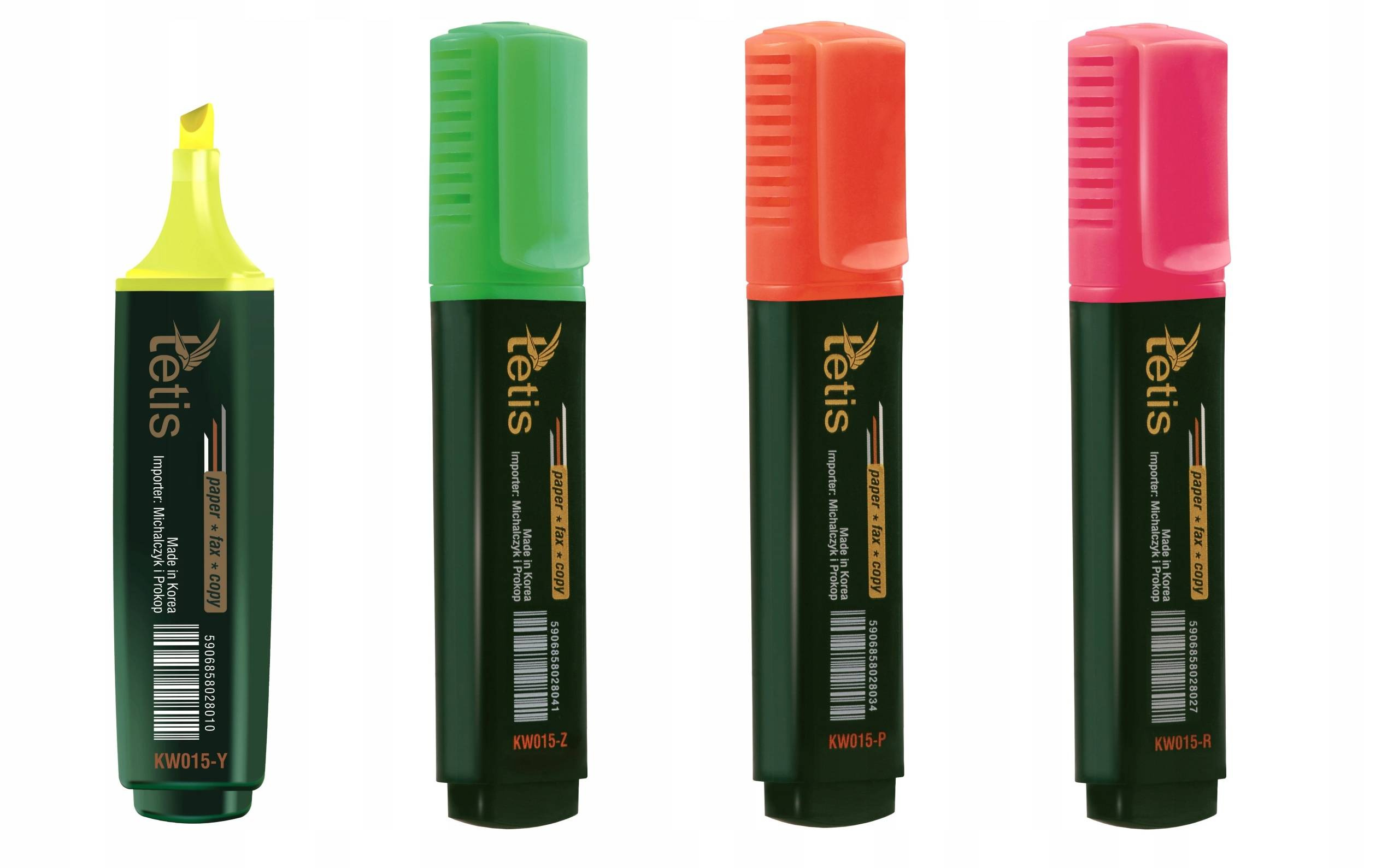 Zakreślacze przeznaczone do papieru zwykłego, samokopiującego i faksowego, końcówka ścięta 5mm. Jednostka sprzedaży - komplet (4 kolory).