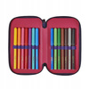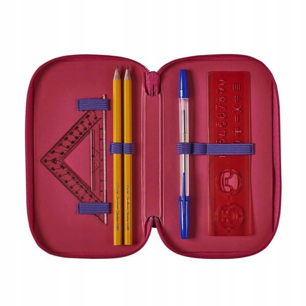 Piórnik Herlitz z trzema komorami wyposażonym w artykuły piśmiennicze i geometryczne.