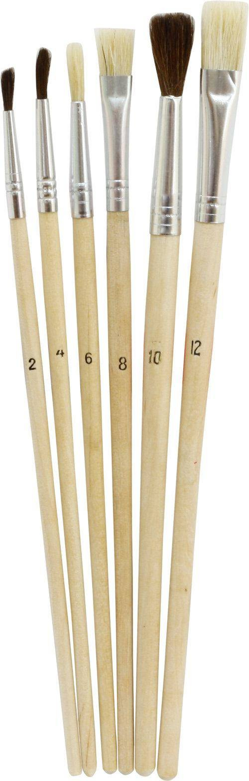 – do farb olejnych i akwareli – artystyczne, 3 płaskie i 3 okrągłe – drewniana rękojeść, metalowe okucie – jasne włosie – szczecina, ciemne włosie – końskie – opak. blister 6 szt. – rozmiary: 2,4,6,8,10, 12