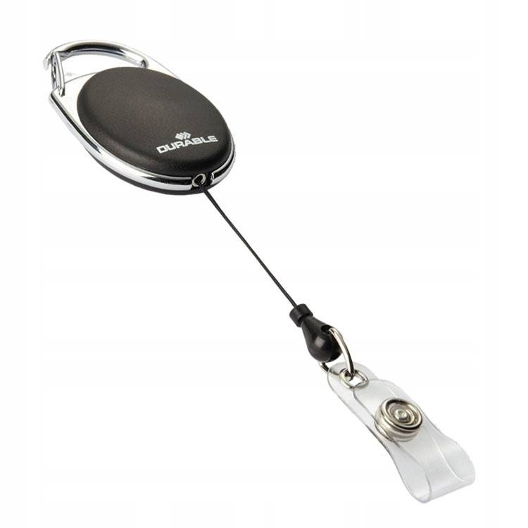 Stylowy owalny mechanizm ściągający z metalowym klipem na tylnej ściance. Umożliwia szybki i łatwy dostęp do karty lub identyfikatorów DURABLE z otworami na klip. Plastikowe zapiecie na zatrzask Długość linki: 80 cm Kolor: czarny