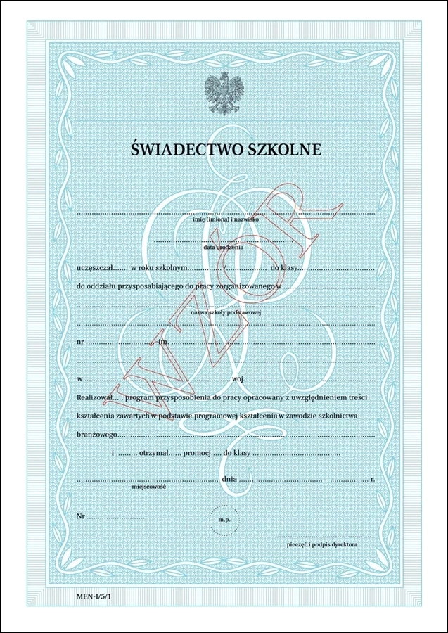 • Świadectwa dla uczniów klas VII oddziałów przysposabiających do pracy organizowanych w szkołach podstawowych dla dzieci i młodzieży