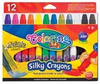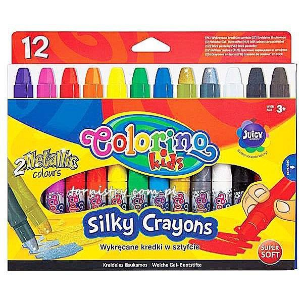 Miękkie,żelowe kredki w sztyfcie 3 w1. Nie kruszą się i nie odpryskują. Można je rozcierać palcami uzyskując efekt suchej pasteli lub za pomocą pędzelka i wody uzyskać efekt akwareli. Bardzo dobre krycie dużych powierzchni. Nie trzeba ich temperować - wystarczy tylko przekręcić i można rysować. Do malowania na papierze, kartonie i drewnie. Plastikowa oprawa chroni ręce przed zabrudzeniem. Zmywalne za pomocą ciepłej wody i mydła. Kartonowe opakowanie zawiera 12 sztuk kredek, również złotą i srebrną.