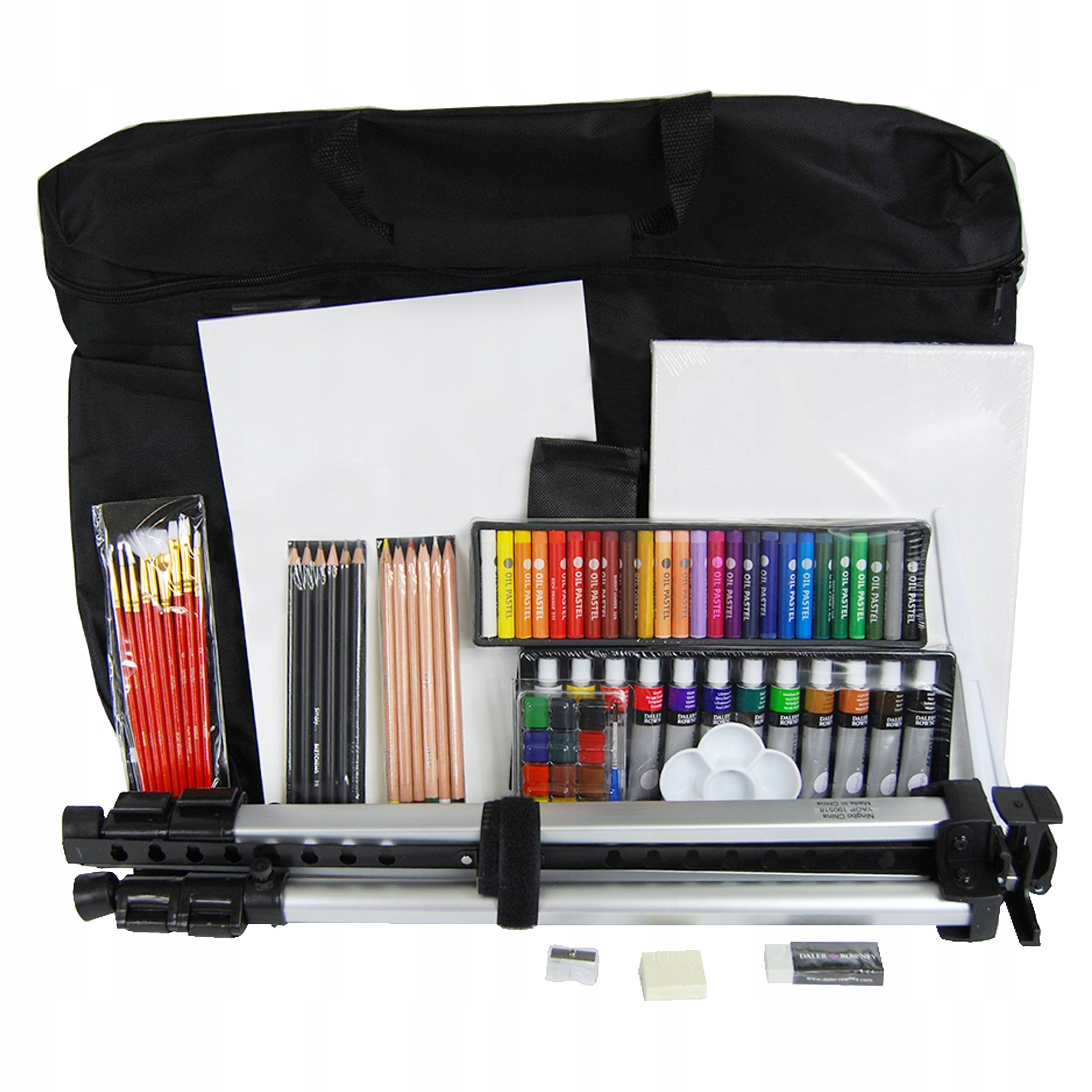 Obszerny zestaw materiałów artystycznych, zawierający w sobie 115 elementy w jednym opakowaniu. Zawiera wszystkie niezbędne akcesoria do malowania, rysowania czy szkicowania. Dzięki czarnej torbie, która jest częścią opakowania, możesz wszędzie nosić ze sobą ulubione artykuły artystyczne, co pozwoli Ci tworzyć także poza pracownią. Aluminiowy stojak, który również znajduje się w zestawie, będzie Twoim wiernym towarzyszem w Twojej artystycznej podróży. Zestaw artystyczny jest odpowiedni dla profesjonalistów, uczniów szkół artystycznych, ale także dla początkujących artystów. Idealnie nadaje się również jako prezent z ważnej okazji.