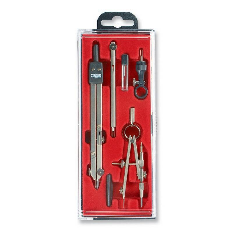 - Profesjonalny zestaw cyrkli zawiera: cyrkiel z łamanymi ramionami (dł. 140 cm, przekrój 3,5 mm, rozwartość ramion: 5-200 mm), zerownik uniwersalny (grafion lub rysik /igła), uchwyt do rapidografu, przedłużacz, zapasowy grafit, śrubokręt