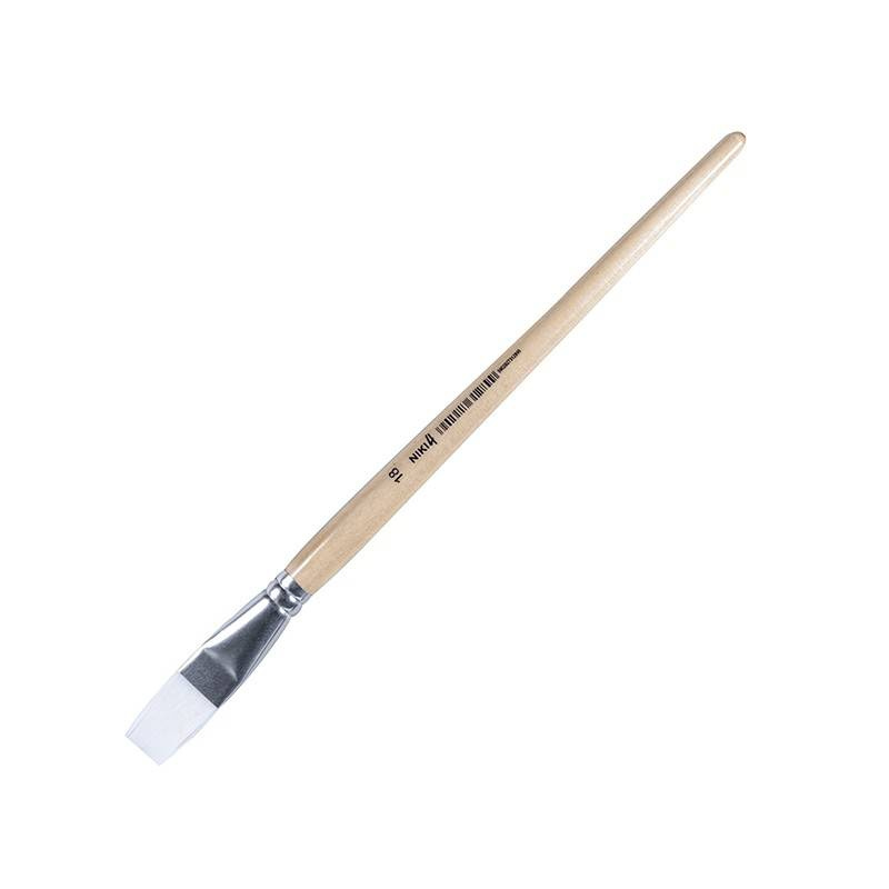 - Płaski pędzel, którego trzon wykonany jest z naturalnego drewna, lakierowanego przezroczystym matowym lakierem UV