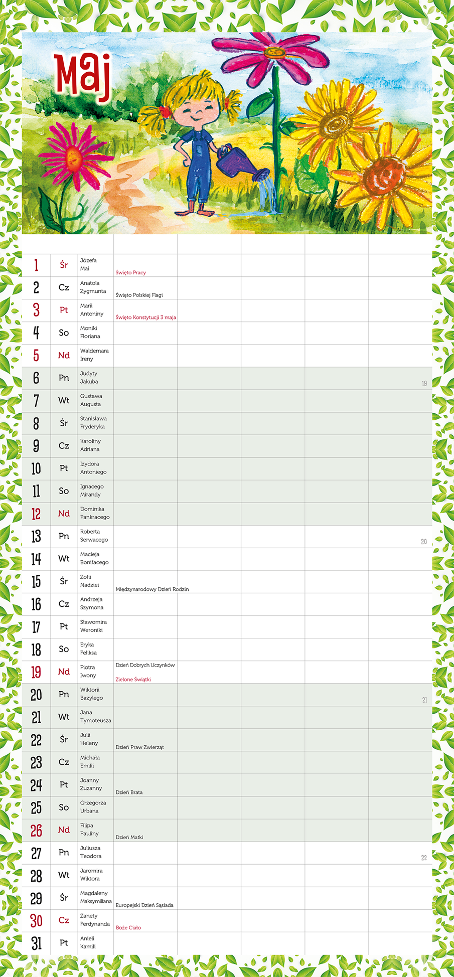 Kalendarz miesięczny wieloplanczowy o wymiarach 218mm x 471mm - kalendarium: 1 miesiąc - 1 strona ilość stron: 12 druk: pełnokolorowy Oprawa - barwna, spiralka z zawieszką.