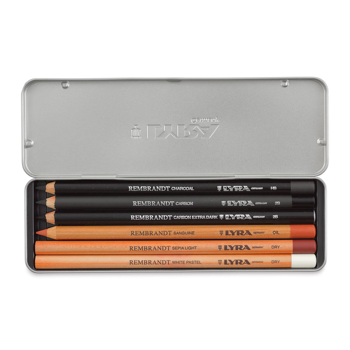 Zawiera White Pastel Dry, Sepia Light Dry, Sanguine Oil, Carbon 2B, Carbon Extra Dark 2B i Charcoal HB w stylowej metalowej puszce.