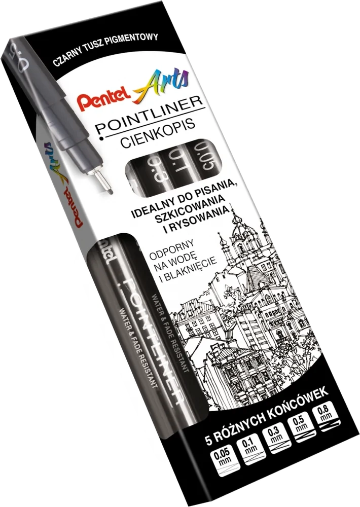 Zestaw 5 precyzyjnych cienkopisów z czarnym tuszem pigmentowym odpornym na wodę oraz blaknięcie - ISO 14145-2:1998.