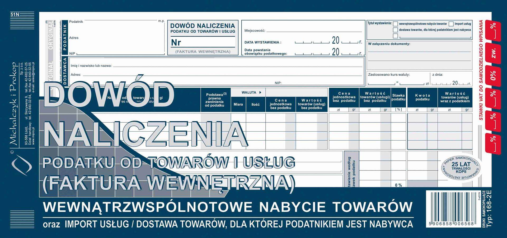 Druk faktury wewnętrznej wewnątrzwspólnotowej UE, dowód naliczenia podatków od towarów i usług. Stosowany do faktur i innych dokumentów wynikających z przepisów o podatku od towarów i usług. TYP: 168-2E Rozmiar: 1/3 A3 Rodzaj papieru: samokopiujący Druk jednostronny (oryginał + kopia) Oprawa: bloczek 80 kartek