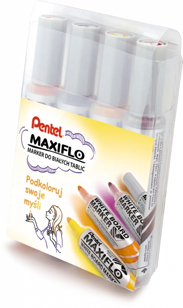 Zestaw 4 markerów MAXIFLO do białych i ceramicznych tablic. Płynny tusz dozowany w razie konieczności nawilżenia końcówki za pomocą tłoczka (zamiast tradycyjnego sączka). Marker pisze wyrazistą linią aż do ostatniej kropli tuszu. Kilkakrotnie dłuższa linii pisania niż w standardowych markerach z sączkiem - 1100 m. Nie zawiera substancji trujących ksylenu, toluenu ani polichlorku winylu. Nadaje się również na papier, plastik, karton. Wykonany w 50% z materiałów przetworzonych. Zestaw MWL5M-4W zawiera 4 markery (brązowy, pomarańczowy, żółty, fioletowy)