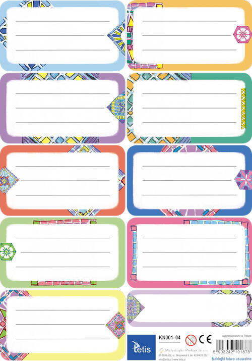 Naklejki na zeszyty i książki - łatwo usuwalne. Na arkuszu znajduje się 9 etykiet.