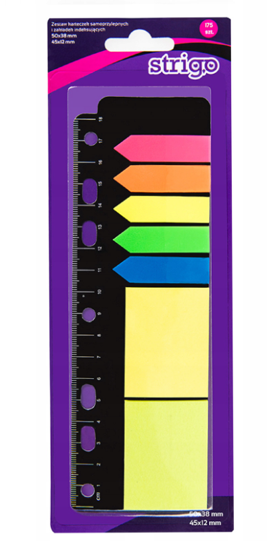 Zestaw, transparentnych, neonowych, samoprzylepnych zakładek indeksujących STRIGO to niezastąpione rozwiązanie do wyraźnego oznaczania treści w dokumentach, rozdziałów książek, podręczników! Jest to świetne rozwiązanie na codzienne zarządzanie zadaniami i priorytetami zarówno w pracy, w szkole, jak i w domu! Idealne dla uczniów i studentów, ponieważ można je wykorzystać do oddzielania informacji. Intensywne kolory zapewnią dobrą czytelność notatek! Zestaw posiada: ✔️ 125 zakładek w tym 5 bloczków po 25 zakładek ✔️50 karteczek, czyli 2 bloczki po 25 karteczek. ✔️W komplecie znajduje się również linijka z perforacją, dzięki czemu całość możemy wpiąć do segregatora. Neonowe kolory karteczek i zakładek momentalnie rzucają się w oczy, tak by nic, co zapisaliśmy, nie umknęło naszej uwadze.