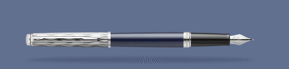 Klasyczne pióro wieczne Hémisphère z serii L'essence Du Blue. Wykończenia - jak i faliście zdobiona skuwka - platerowane drogocennym palladem. Korpus pokryty ciemno-niebieskim błyszczącym lakierem. Stalowa stalówka w rozmiarze F (cienka). Pióro przystosowane do naboi atramentowych. Może być również używane z wymiennym tłoczkiem.
