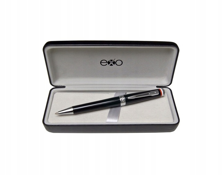 Elegancki długopis HUSARIA Polska, polskiej marki exo, posiada korpus pokryty czarnym błyszczącym lakierem oraz chromowane wykończenia.