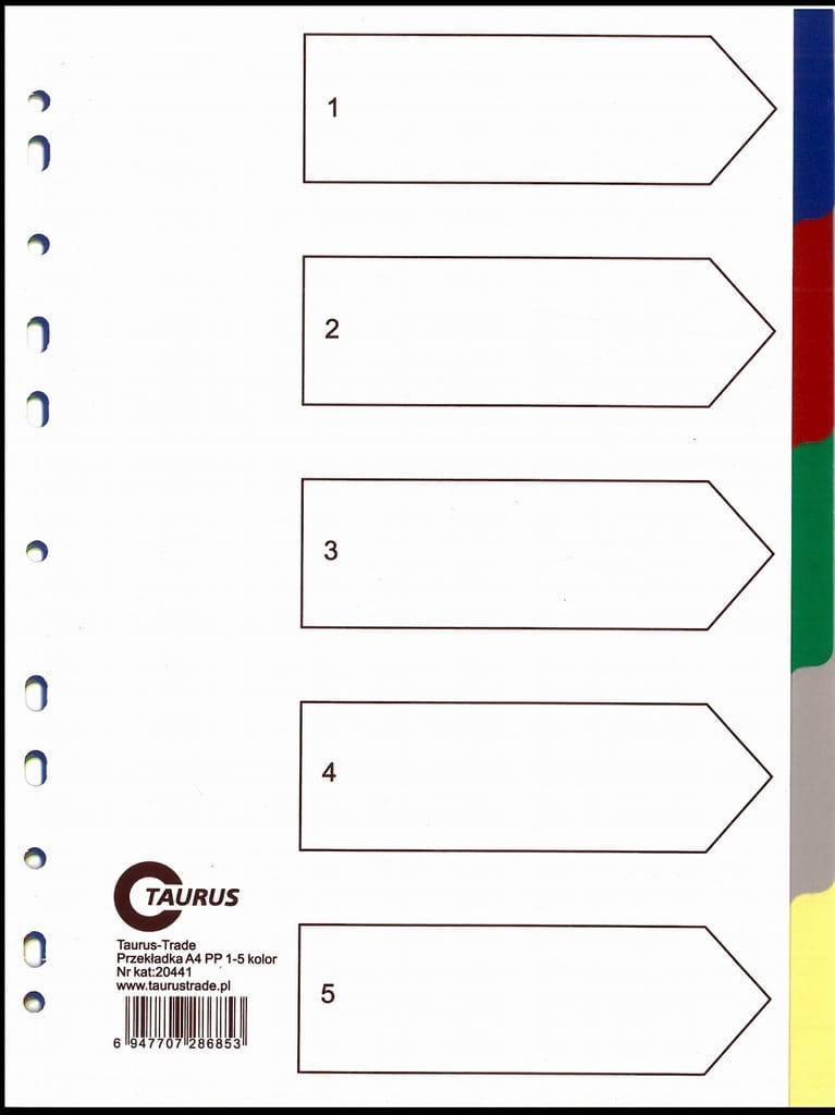 PRZEKŁADKI TAURUS DO SEGREGATORA PP A4 1-5 KOLOR