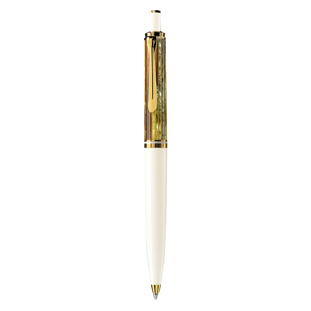 Souverän – światowej sławy klasyk. Produkcja etui Souverän podlega skomplikowanemu procesowi. Typowy, paskowany materiał jest wykonany z bawełny na podstawie formuły opracowanej specjalnie dla Pelikan. Ukończenie bloku zapewniającego paski zajmuje miesiąc, po czym poszycie szyte na miarę jest wyginane i wycinane w kontur za pomocą naturalnego diamentu. Charakterystyczne podwójne pierścienie są następnie integrowane z nasadką i korpusem z najwyższą precyzją. Następnie przyrząd do pisania jest polerowany, aż osiągnie błyszczący połysk. Długopis K400 z mechanizmem przyciskowym jest wyposażony w czarny wkład o dużej pojemności.”