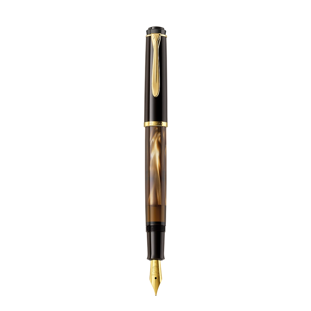 Korpusy piór wykonane są z wysokiej jakości żywicy, która jest najpierw toczona, a następnie polerowana na wysoki połysk. Materiał marmurkowy w kolorze złota jest dodatkowo udoskonalony złoconą stalówką i ozdobnymi elementami wykończeniowymi. Wszystkie pierścienie i tradycyjny klips Pelikan są pokryte 24-karatowym złotem. Te pióra wieczne posiadają również opatentowany mechanizm tłokowy różnicowy Pelikan i są wyposażone w złoconą stalówkę ze stali nierdzewnej.
