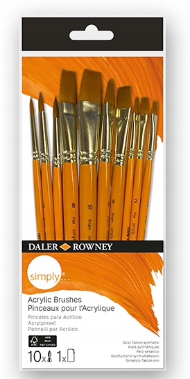 Pędzle Simply Acrylic Daler-Rowney są wykonane z taklonu w kolorze złotym – jest to materiał syntetyczny, który został opracowany tak, aby wykazywać właściwości jakościowo najlepszego włosia. Asortyment pędzli Simply Acrylic polecany jest początkującym i hobbystom.
