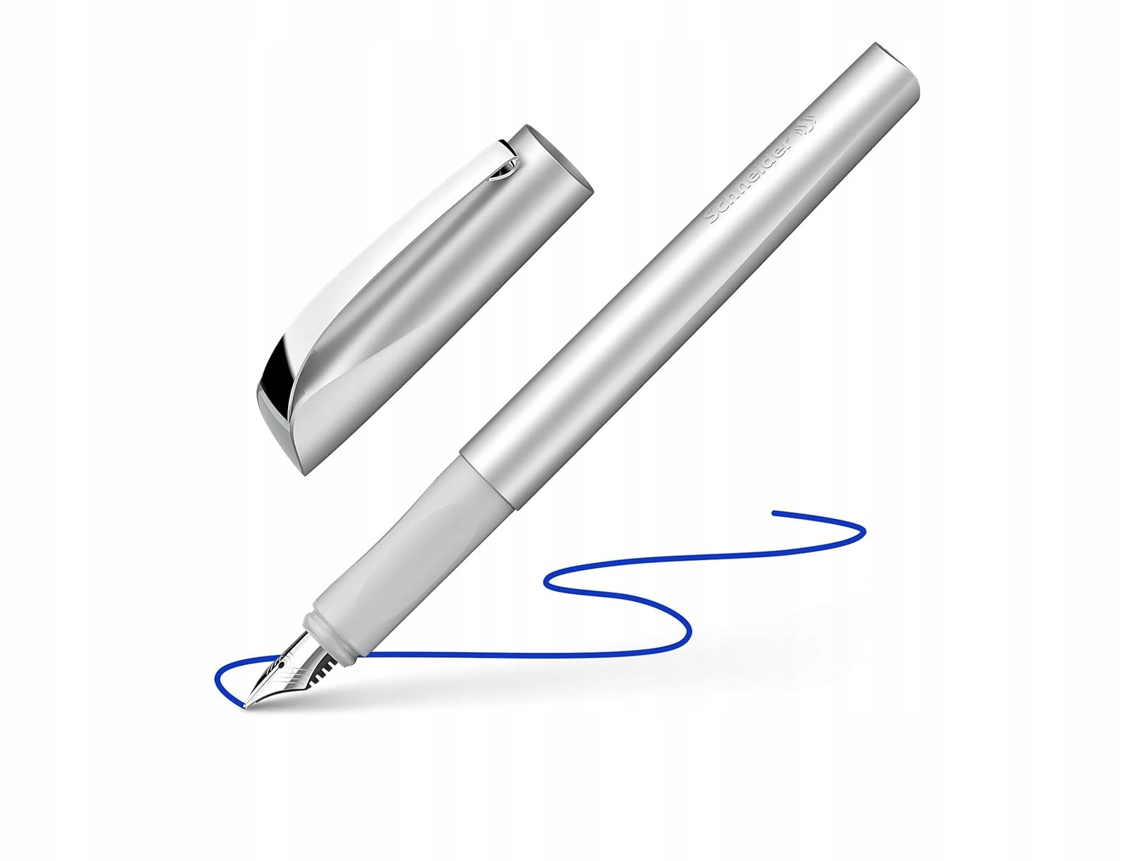 Pióro wieczne o ergonomicznym kształcie, gumowanym uchwycie i wysokiej jakości stalówką ze stali nierdzewnej z irydową końcówką o grubości linii pisania M. Nowoczesny design z eleganckim, metalicznym połyskiem oraz solidnym metalowym klipem. Wyposażony w wymazywalny, klastyczny, atramentowy wkład koloru niebieskiego. Pióro w kolorze Shiny Silver, odpowiedni zarówno dla prawo i leworęcznych.