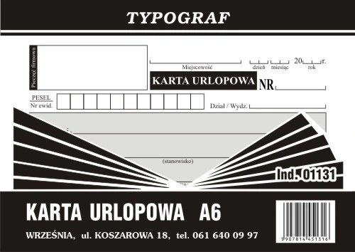 Karta urlopowa Typograf A6 01131 to praktyczne i eleganckie rozwiązanie, które pomoże w zarządzaniu dniami wolnymi od pracy. Wykonana z wysokiej jakości materiałów, charakteryzuje się estetycznym wzornictwem, które wpisuje się w nowoczesne trendy biurowe. Dzięki odpowiednim wymiarom A6, karta jest poręczna i łatwa do przechowywania, co sprawia, że znajdzie swoje miejsce w każdym notesie, organizerze czy teczce.
