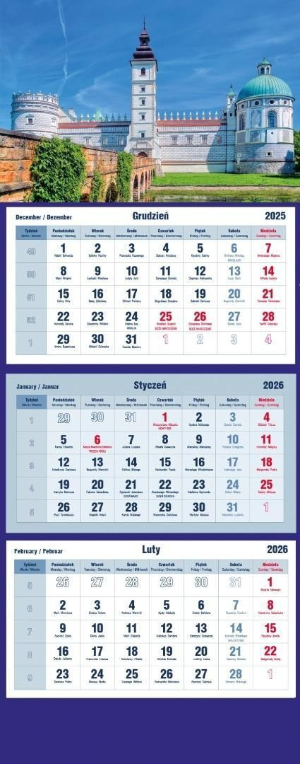 Kalendarz trójdzielny o wymiarach 315mm x 855mm kalendarium: 1 miesiąc - 1 kartka ilość stron: 12 druk: pełnokolorowy Główka pełnokolorowa, okienko przesuwane, nazwy miesięcy i tygodni w wersjach językowych, miejsce na nadruk reklamowy.