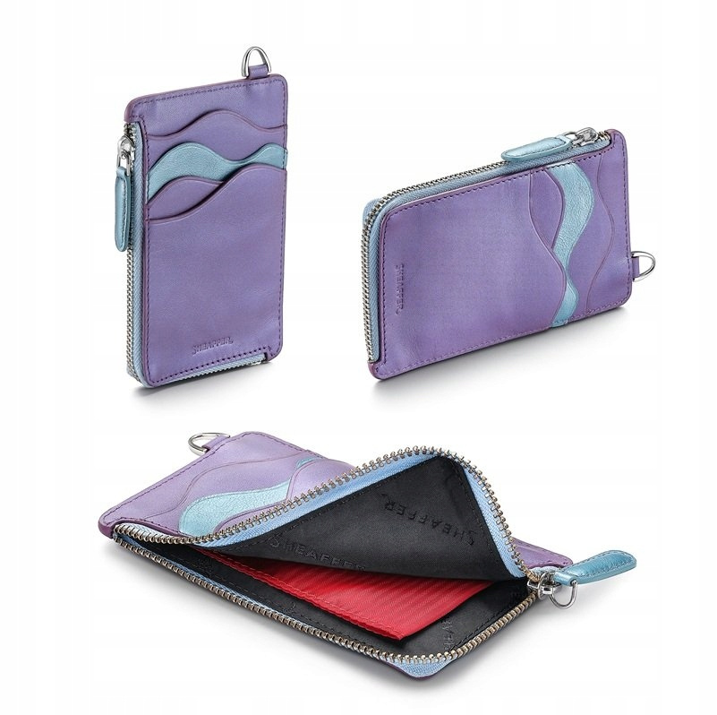 Zestaw upominkowy Sheaffer VFM Expression składający się z długopisu VFM 9430 z portfelikiem w kolorze niebiesko-fioletowym z perłowym gradientem i z niebieskim etui na karty kredytowe, wykonanym z prawdziwej skóry.