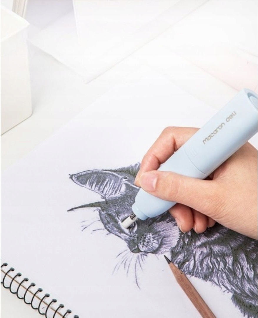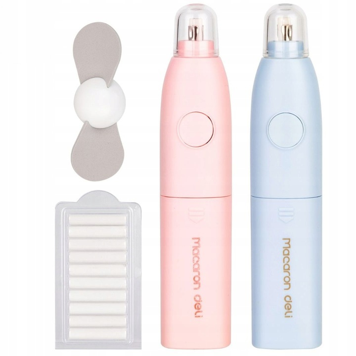 Gumka elektryczna Deli EH02701 z funkcją wiatraczka. Dwa kolory w asortymencie: Coral Pink i Mist Blue. Produkt 2w1 służy jako gumka do wymazywania grafitu oraz jako mini wentylator. Obudowa wykonana z tworzywa PP. Produkt bezpieczny nie zawiera PVC i jest nietoksyczny.