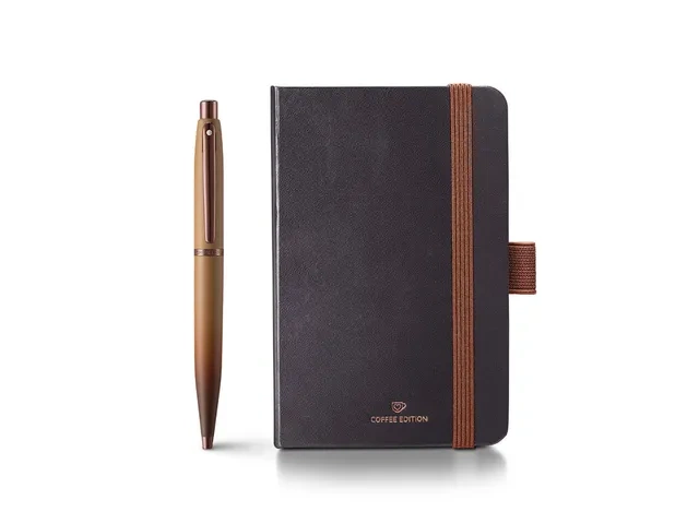 Zestaw upominkowy Sheaffer: długopis VFM E9428 i notes A6. Ten jasnobrązowy długopis z gradientowym odcieniem kawy o matowej fakturze i kawowo-brązowym wykończeniu PVD gwarantuje precyzyjny i niezawodny komfort pisania. W zestawie znajduje się uniwersalny wkład Sheaffer Medium w kolorze czarnym. Popularny długopis Sheaffer VFM zachwyca nowoczesną, zwężaną sylwetką i łączy współczesną elegancję z najwyższą jakością. Ta edycja Coffee Edition idealnie nadaje się do codziennego użytku i została zaprojektowana dla miłośników kawy, którzy lubią bawić się słowami. Na odwrocie długopisu znajduje się ekskluzywne logo. Na klipsie znajduje się rozpoznawalna na całym świecie biała kropka Sheaffer, symbolizująca doskonałość, jakość i prestiż w pisaniu. Długopis i notes są zapakowane w eleganckie pudełko prezentowe.