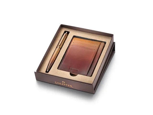 Zestaw upominkowy Sheaffer: długopis VFM E9428 i etui na karty kredytowe. Ten jasnobrązowy długopis z gradientowym odcieniem kawy o matowej fakturze i kawowo-brązowym wykończeniu PVD gwarantuje precyzyjne i niezawodne pisanie. W zestawie znajduje się uniwersalny wkład Sheaffer Medium w kolorze czarnym. Popularny długopis Sheaffer VFM zachwyca nowoczesną, zwężaną sylwetką i łączy współczesną elegancję z najwyższą jakością. Ta edycja Coffee Edition idealnie nadaje się do codziennego użytku i została zaprojektowana dla miłośników kawy, którzy lubią bawić się słowami. Długopis posiada ekskluzywne insygnia na odwrocie. Na klipsie znajduje się rozpoznawalna na całym świecie biała kropka Sheaffer, symbolizująca doskonałość, jakość i prestiż w pisaniu. Długopis i etui na karty kredytowe są zapakowane w piękne pudełko prezentowe.